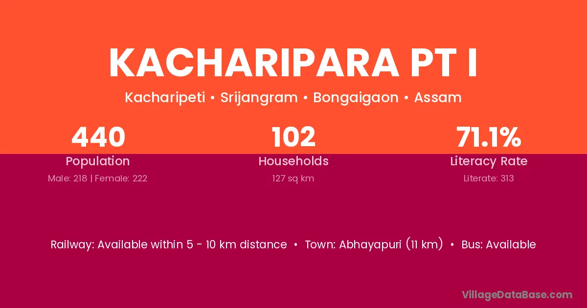 Kacharipara Pt I village has a total population of 440 people, of which 218 are males and 222 are females.