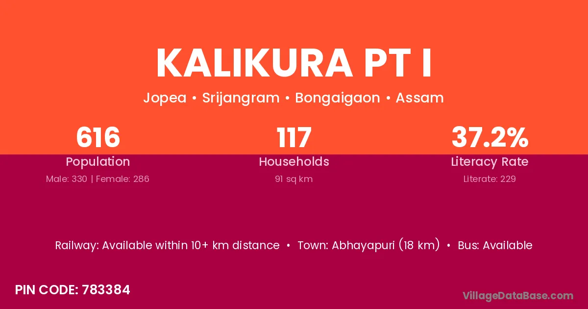Abhayapuri (18 km) is the nearest town to Kalikura Pt I village for major economic activities and is located approximately 18 km away.