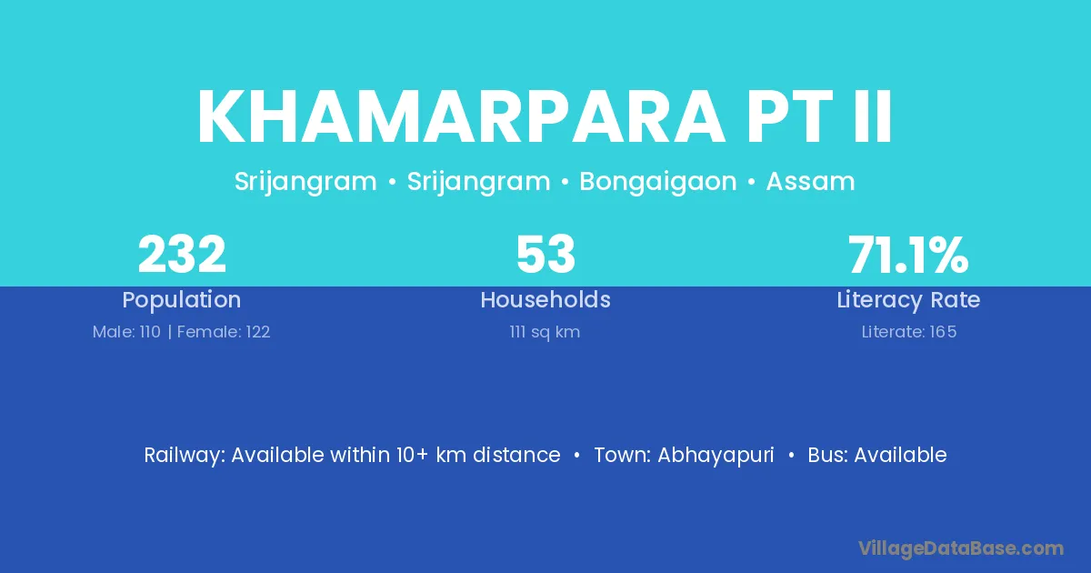Khamarpara Pt Ii village has a total population of 232 people, of which 110 are males and 122 are females.