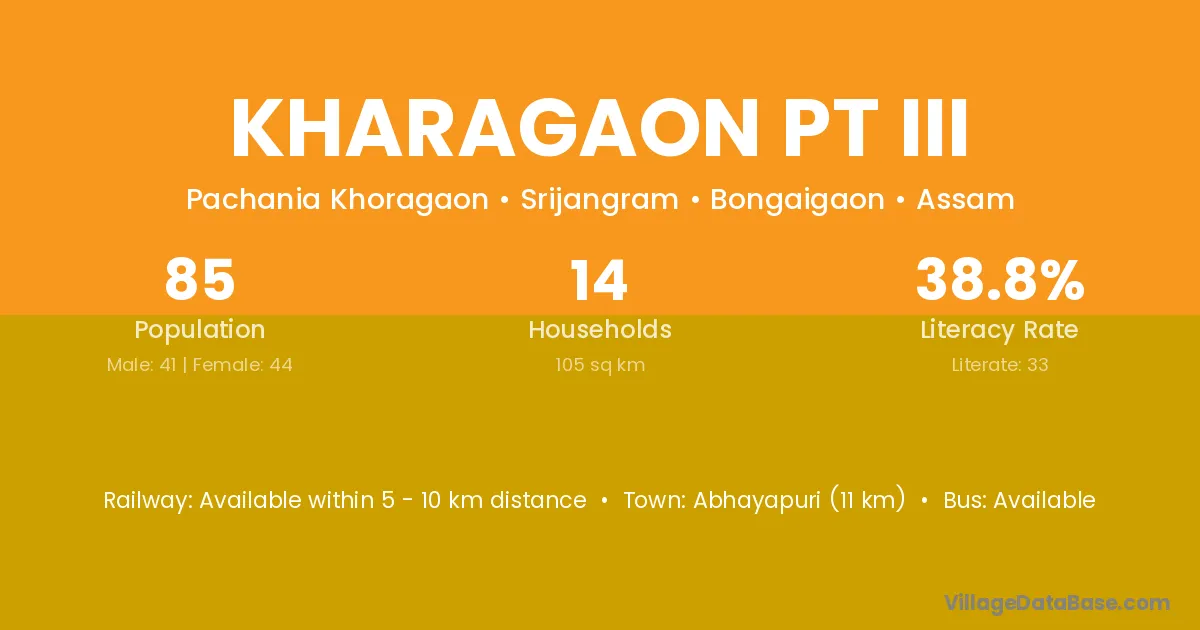 Kharagaon Pt Iii village has a total population of 85 people, of which 41 are males and 44 are females.