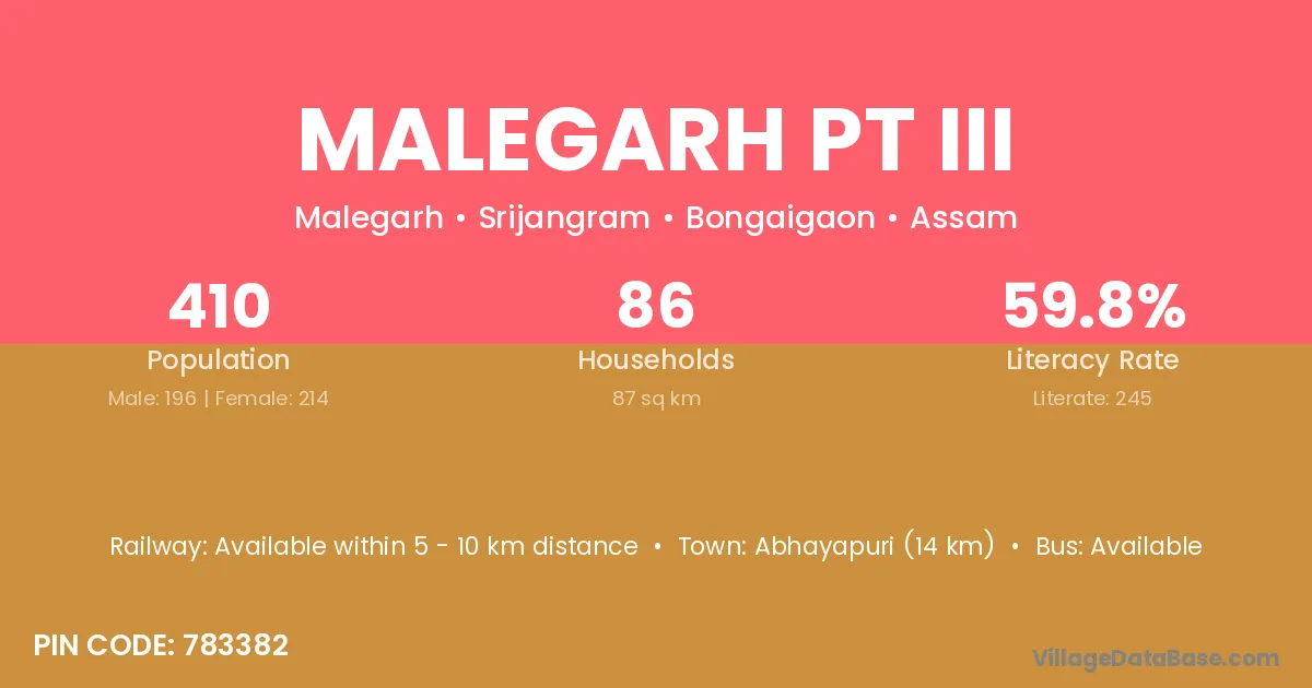 Abhayapuri (14 km) is the nearest town to Malegarh Pt Iii village for major economic activities and is located approximately 14 km away.
