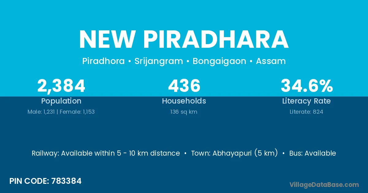 Abhayapuri (5 km) is the nearest town to New Piradhara village for major economic activities and is located approximately 5 km away.