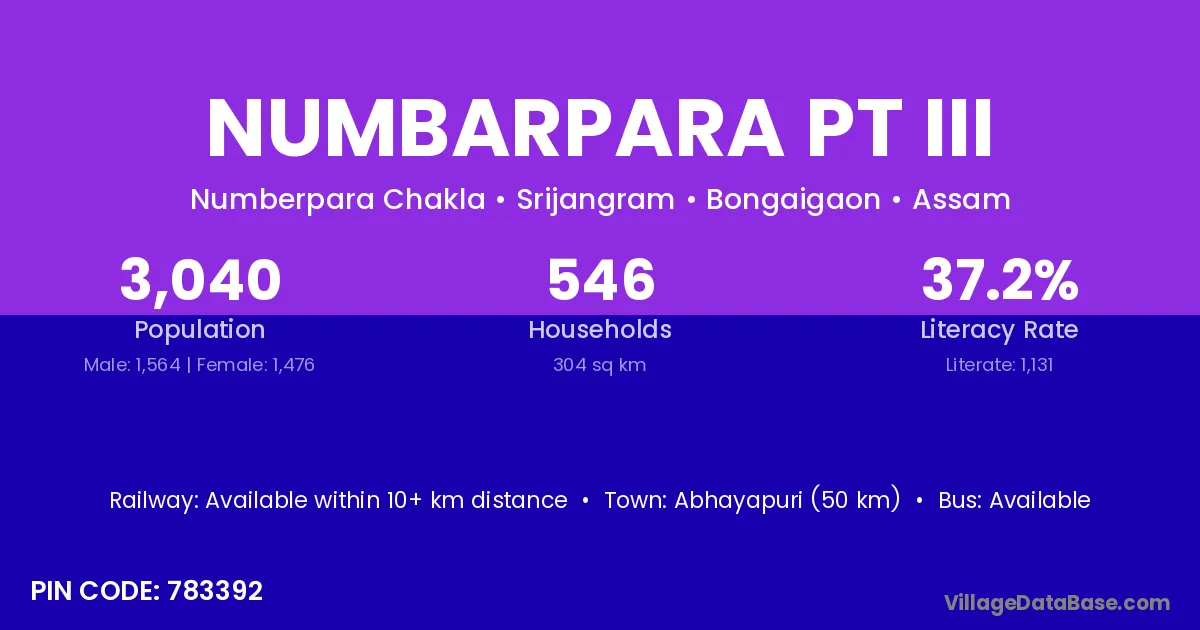 Abhayapuri (50 km) is the nearest town to Numbarpara Pt Iii village for major economic activities and is located approximately 50 km away.