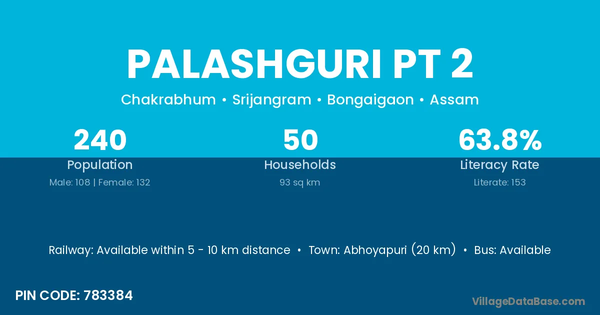 Abhoyapuri (20 km) is the nearest town to Palashguri Pt 2 village for major economic activities and is located approximately 20 km away.