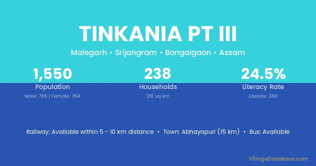 Abhayapuri (15 km) is the nearest town to Tinkania Pt Iii village for major economic activities and is located approximately 15 km away.