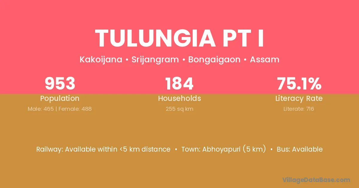 Abhoyapuri (5 km) is the nearest town to Tulungia Pt I village for major economic activities and is located approximately 5 km away.
