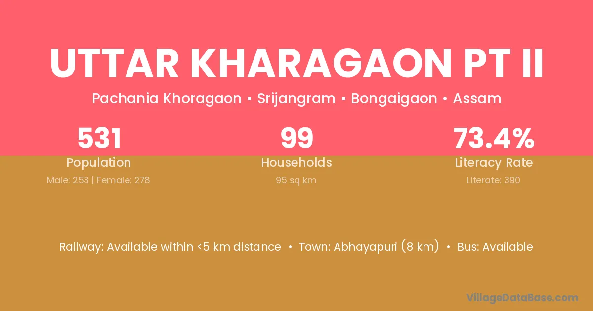 Uttar Kharagaon Pt Ii village has a total population of 531 people, of which 253 are males and 278 are females.