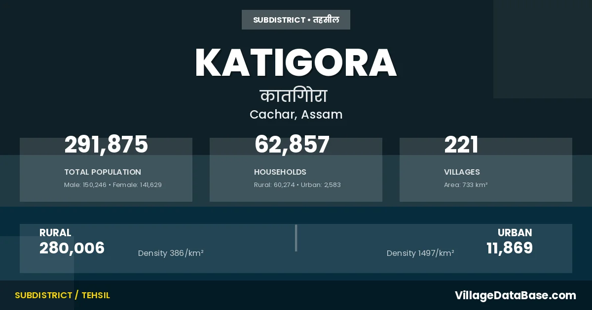 Katigora is a town and Subdivision in the Cachar district of the Assam. In India, a Subdivision is a subdivision of a district responsible for the administration and revenue collection of a specific area within the district. Subdivisions play a crucial role in the local governance structure, contributing significantly to the development and administration of their communities.