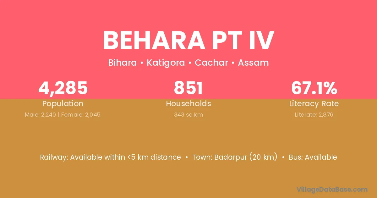 Badarpur (20 km) is the nearest town to Behara Pt Iv village for major economic activities and is located approximately 20 km away.