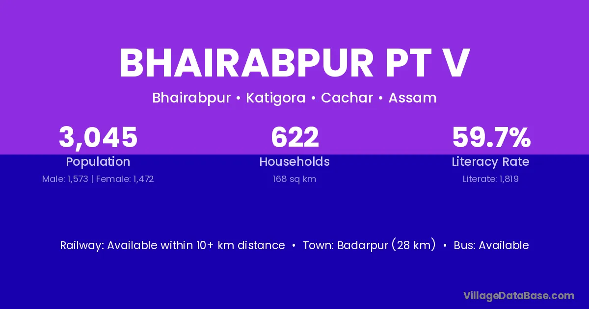 Badarpur (28 km) is the nearest town to Bhairabpur Pt V village for major economic activities and is located approximately 28 km away.
