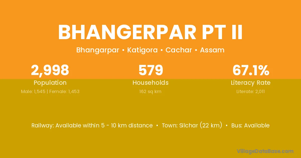 Silchar (22 km) is the nearest town to Bhangerpar Pt Ii village for major economic activities and is located approximately 22 km away.