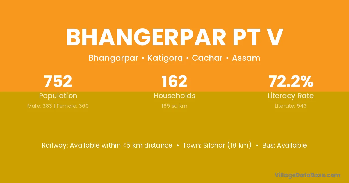 Silchar (18 km) is the nearest town to Bhangerpar Pt V village for major economic activities and is located approximately 18 km away.