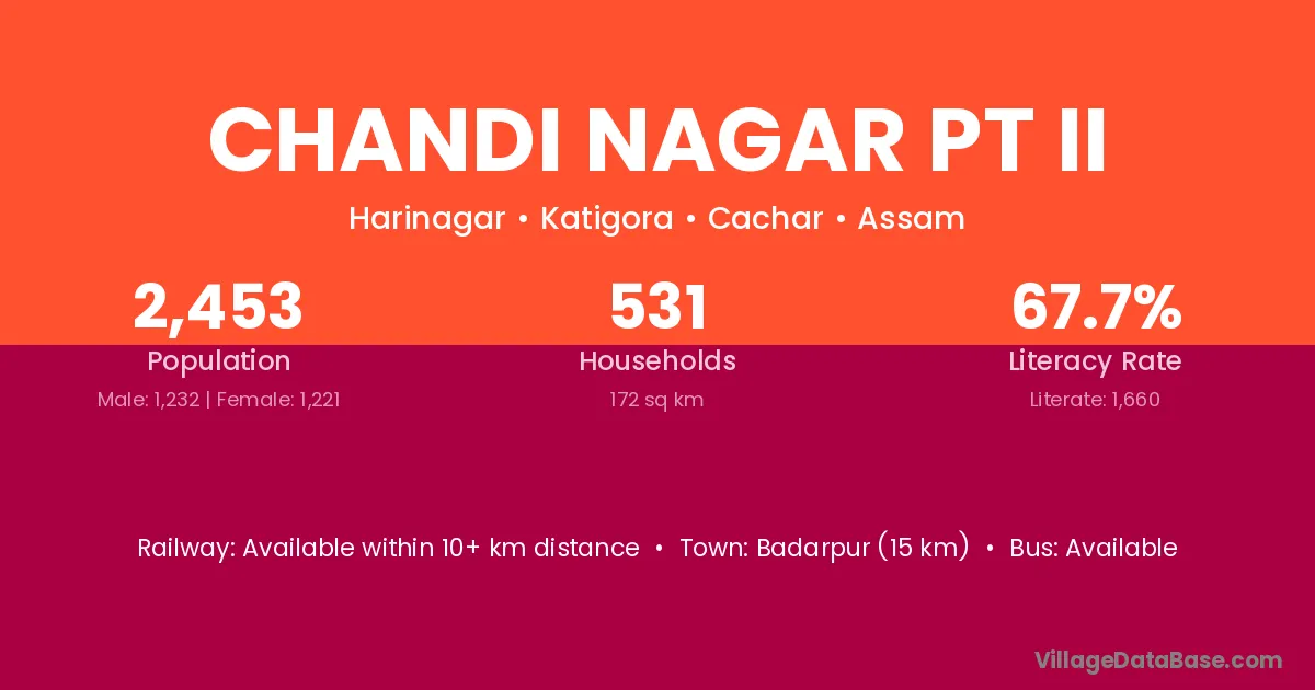 Chandi Nagar Pt Ii village has a total population of 2,453 people, of which 1,232 are males and 1,221 are females.