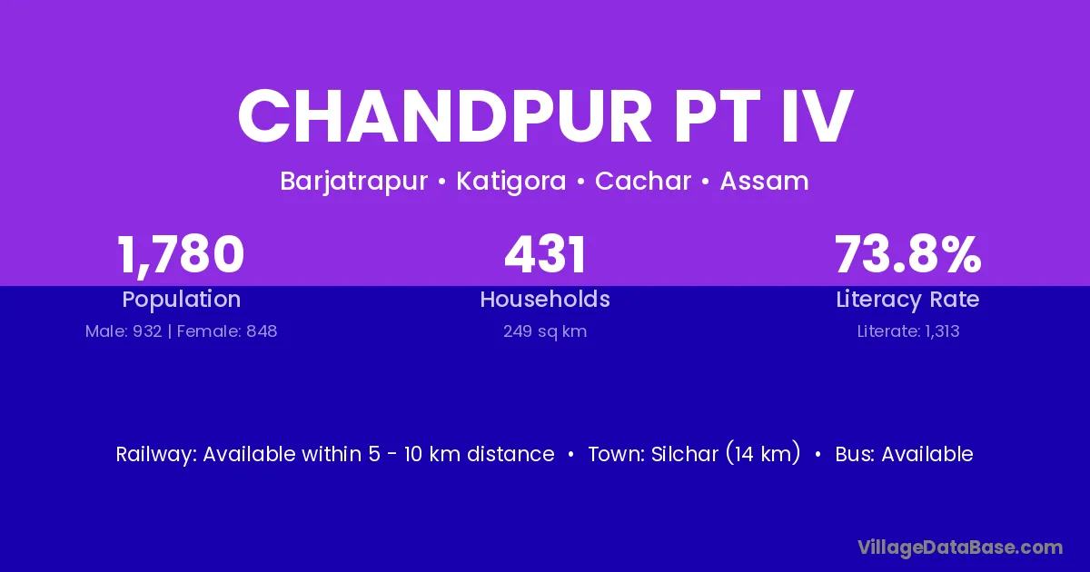 Silchar (14 km) is the nearest town to Chandpur Pt Iv village for major economic activities and is located approximately 14 km away.