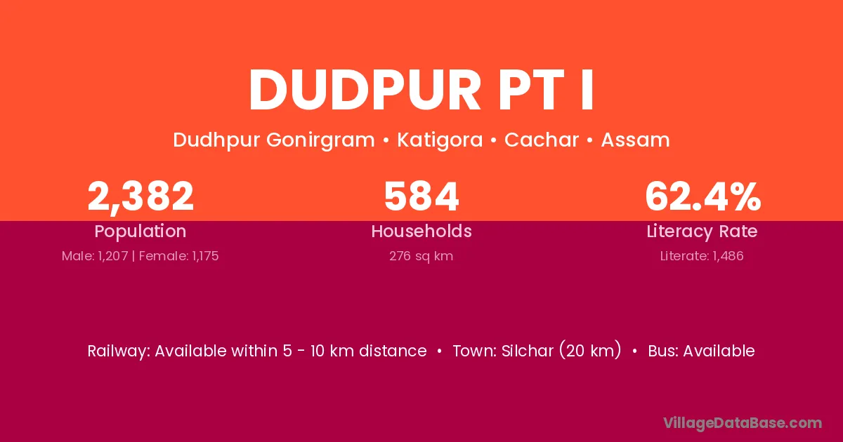 Silchar (20 km) is the nearest town to Dudpur Pt I village for major economic activities and is located approximately 20 km away.