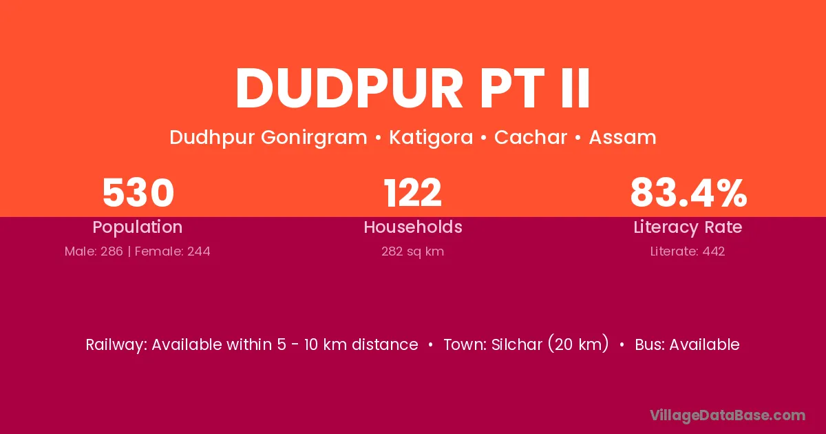 Silchar (20 km) is the nearest town to Dudpur Pt Ii village for major economic activities and is located approximately 20 km away.
