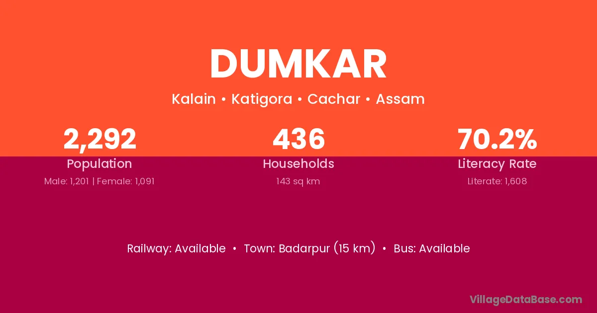 Badarpur (15 km) is the nearest town to Dumkar village for major economic activities and is located approximately 15 km away.