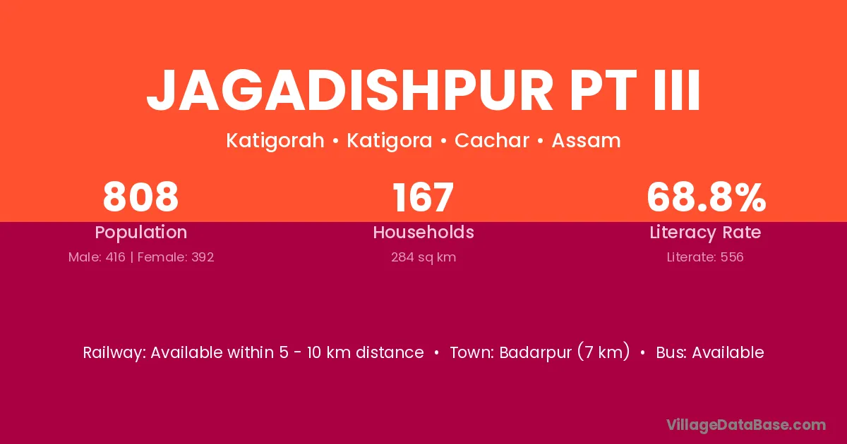 Badarpur (7 km) is the nearest town to Jagadishpur Pt Iii village for major economic activities and is located approximately 7 km away.