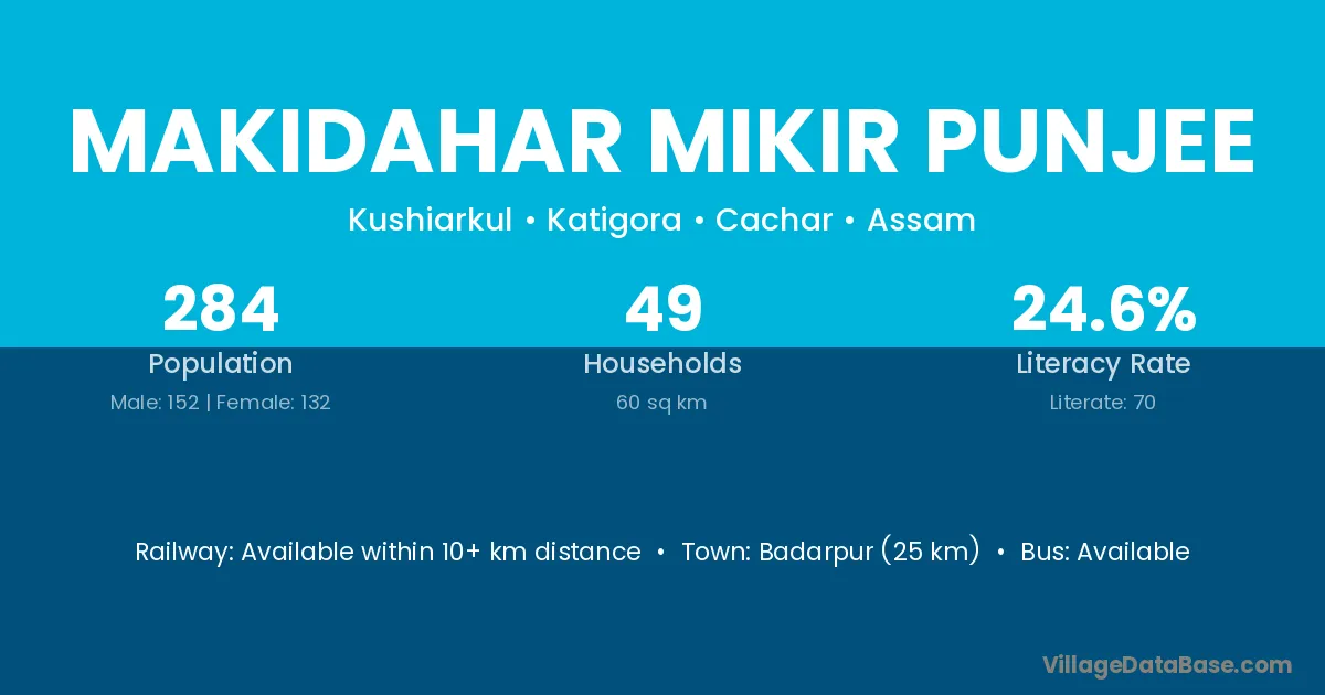 Badarpur (25 km) is the nearest town to Makidahar Mikir Punjee village for major economic activities and is located approximately 25 km away.