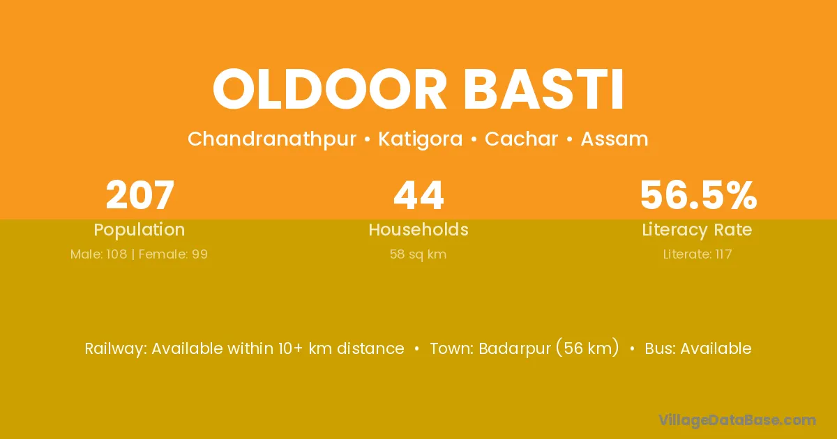 Badarpur (56 km) is the nearest town to Oldoor Basti village for major economic activities and is located approximately 56 km away.