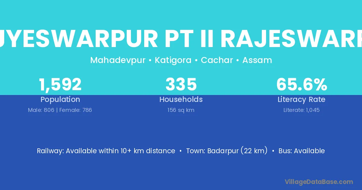 Rajyeswarpur Pt Ii Rajeswarpur village has a total population of 1,592 people, of which 806 are males and 786 are females.