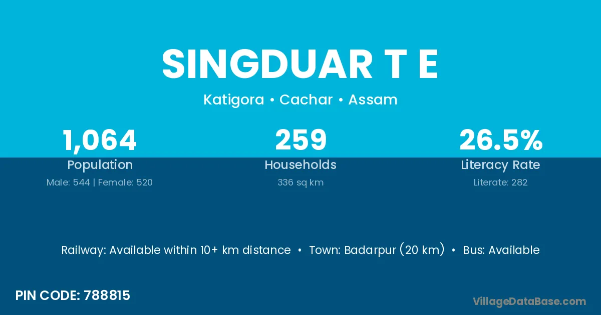 Badarpur (20 km) is the nearest town to Singduar T E village for major economic activities and is located approximately 20 km away.