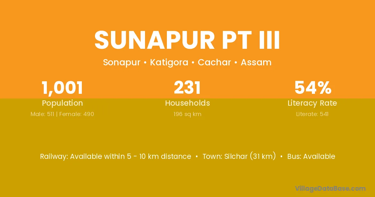 Silchar (31 km) is the nearest town to Sunapur Pt Iii village for major economic activities and is located approximately 31 km away.