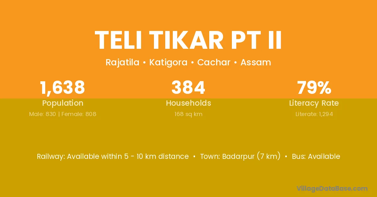 Badarpur (7 km) is the nearest town to Teli Tikar Pt Ii village for major economic activities and is located approximately 7 km away.