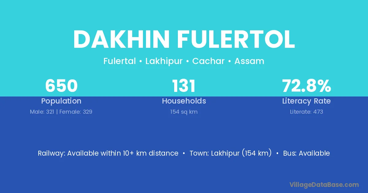 Lakhipur (154 km) is the nearest town to Dakhin Fulertol village for major economic activities and is located approximately 154 km away.