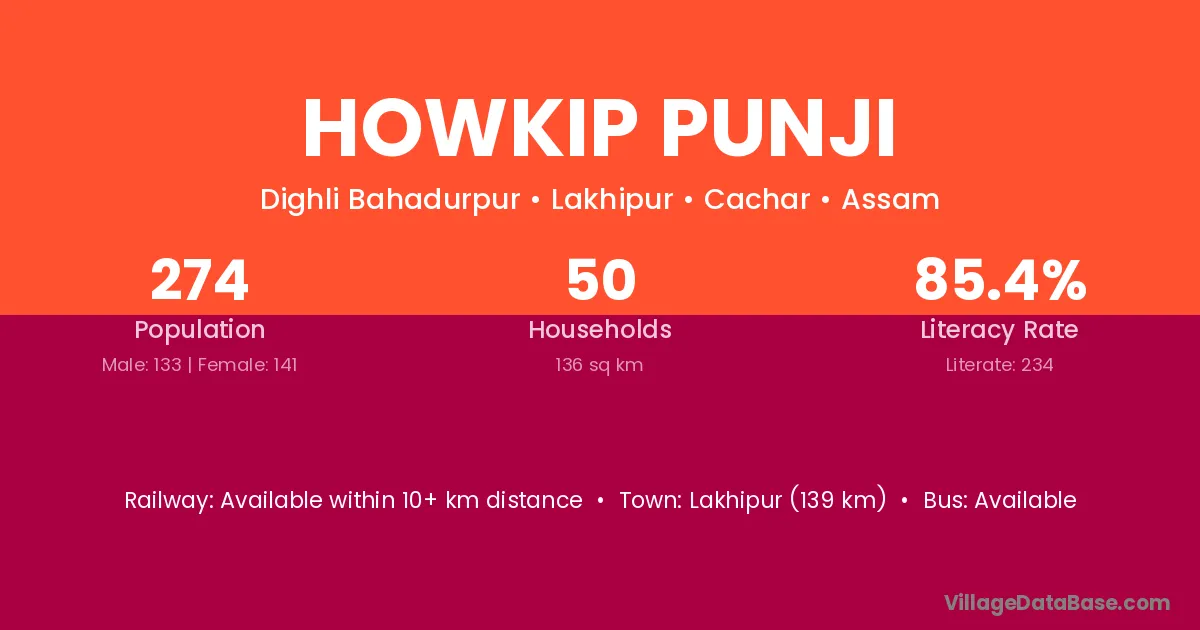 Lakhipur (139 km) is the nearest town to Howkip Punji village for major economic activities and is located approximately 139 km away.
