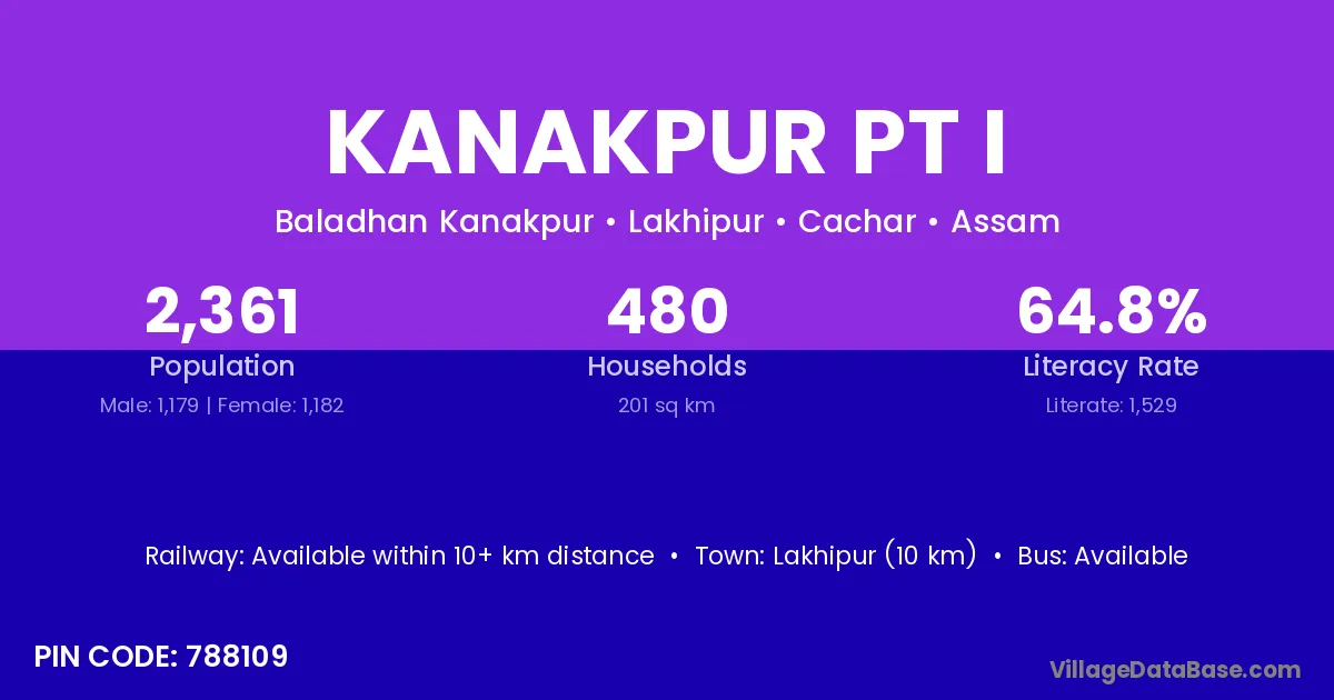 Lakhipur (10 km) is the nearest town to Kanakpur Pt I village for major economic activities and is located approximately 10 km away.
