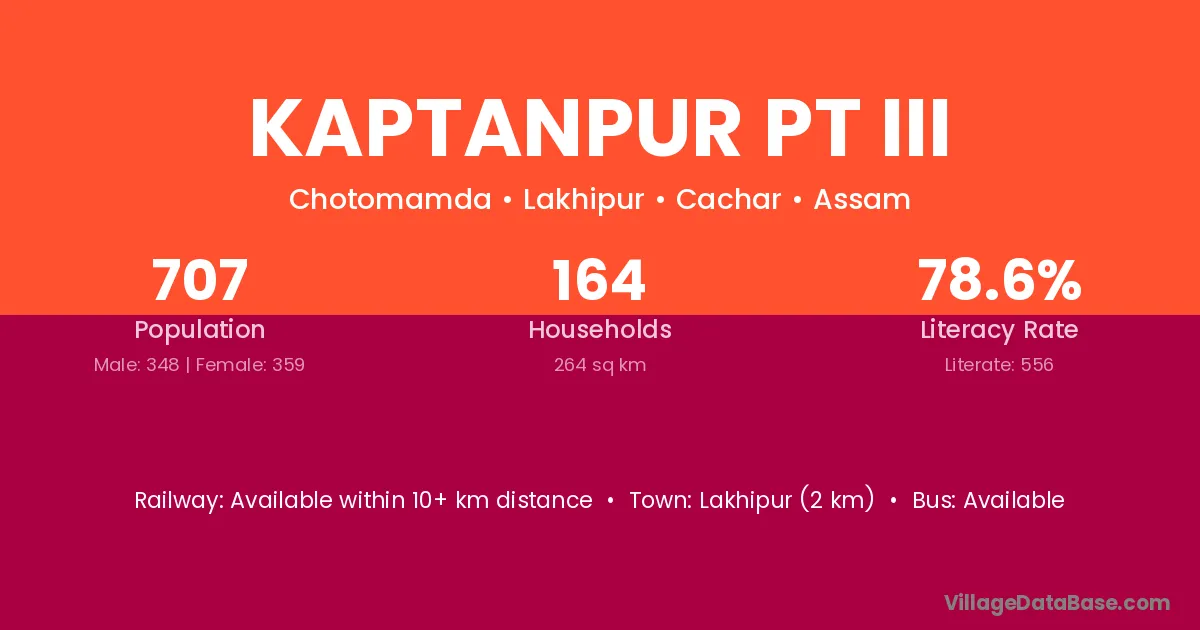 Lakhipur (2 km) is the nearest town to Kaptanpur Pt Iii village for major economic activities and is located approximately 2 km away.