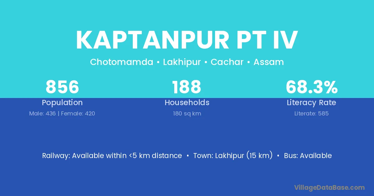 Lakhipur (15 km) is the nearest town to Kaptanpur Pt Iv village for major economic activities and is located approximately 15 km away.