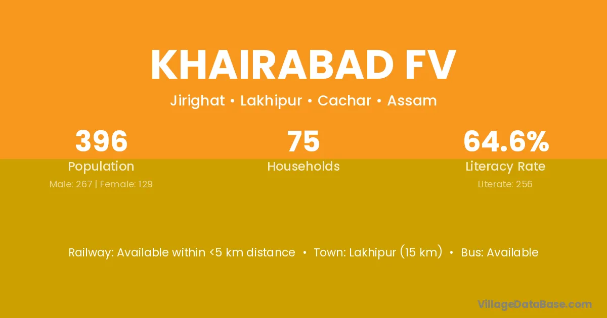 Lakhipur (15 km) is the nearest town to Khairabad Fv village for major economic activities and is located approximately 15 km away.