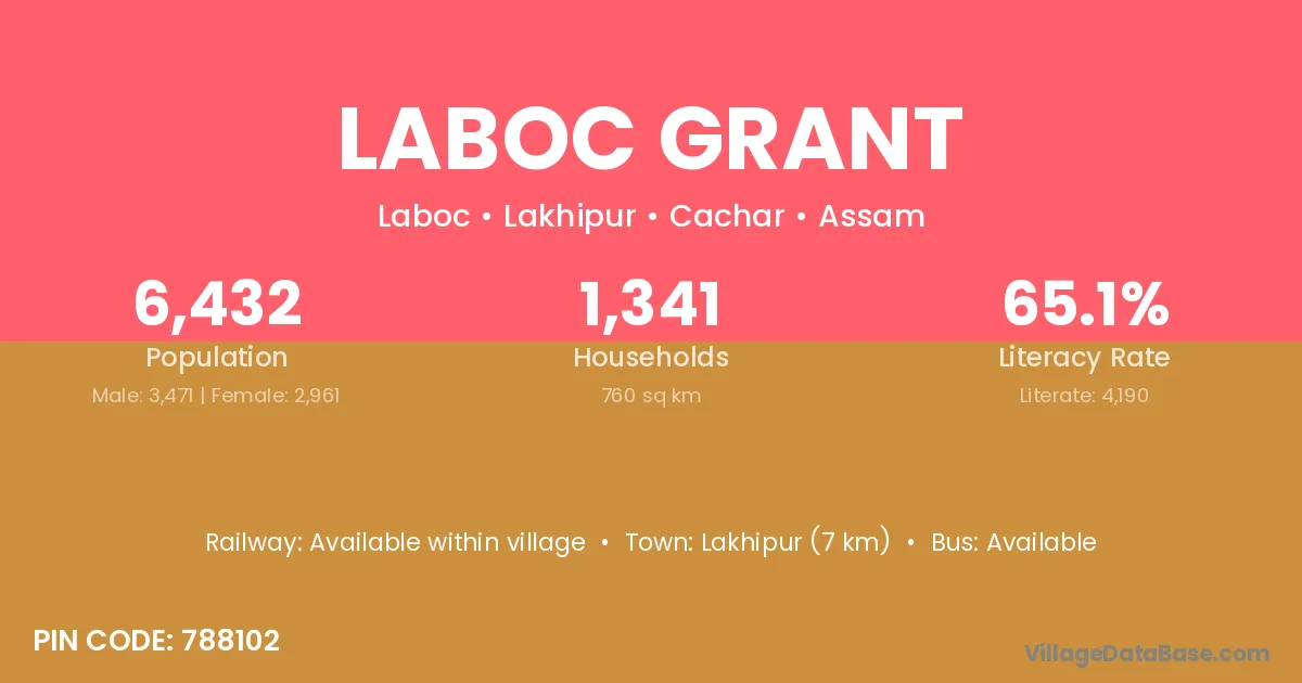 Lakhipur (7 km) is the nearest town to Laboc Grant village for major economic activities and is located approximately 7 km away.
