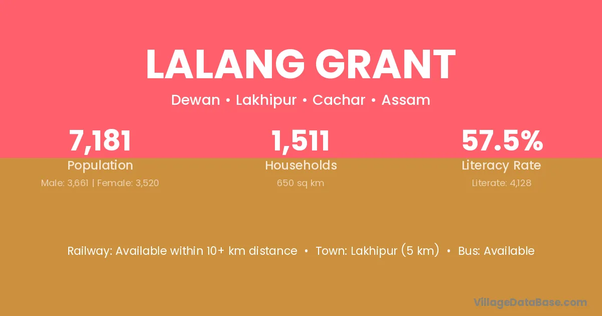 Lakhipur (5 km) is the nearest town to Lalang Grant village for major economic activities and is located approximately 5 km away.