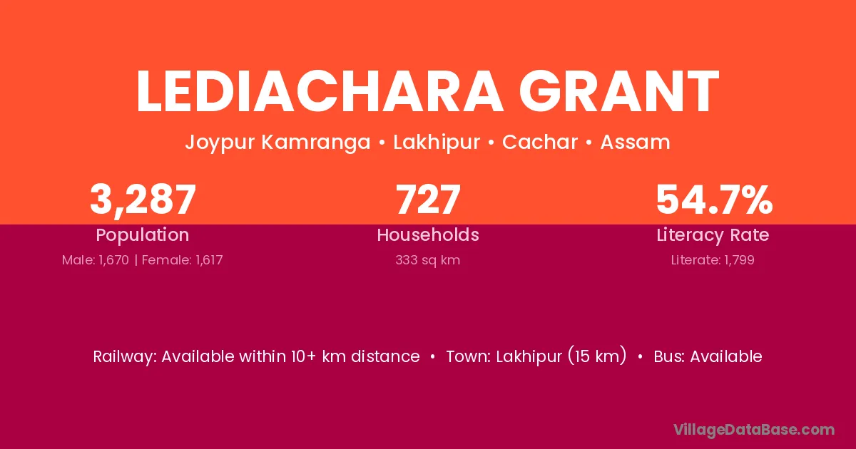 Lakhipur (15 km) is the nearest town to Lediachara Grant village for major economic activities and is located approximately 15 km away.