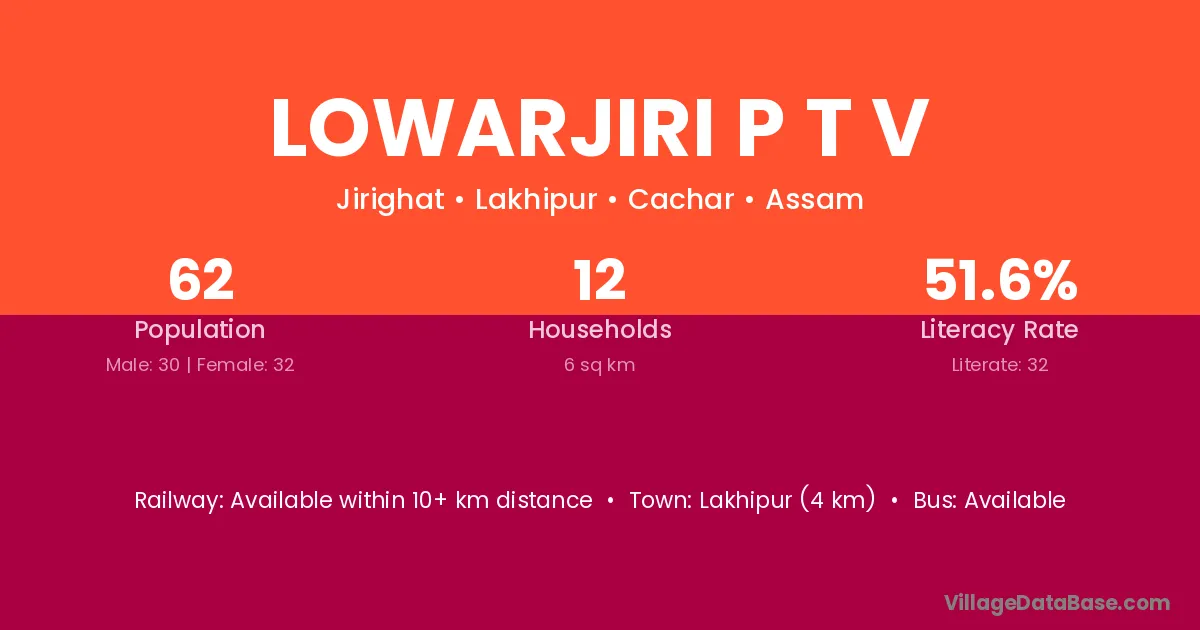 Lowarjiri P T V village has a total population of 62 people, of which 30 are males and 32 are females.