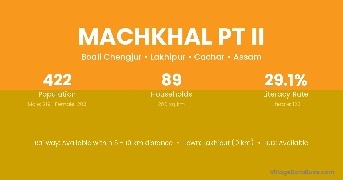 Lakhipur (9 km) is the nearest town to Machkhal Pt Ii village for major economic activities and is located approximately 9 km away.