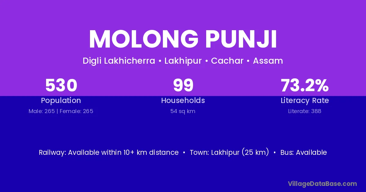 Lakhipur (25 km) is the nearest town to Molong Punji village for major economic activities and is located approximately 25 km away.