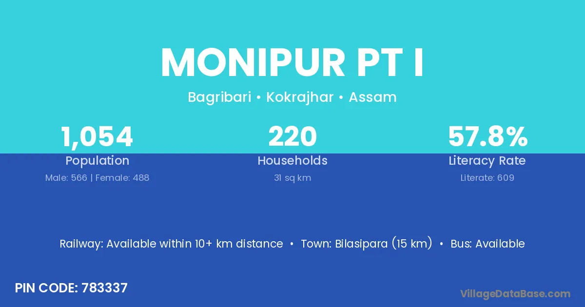 Lakhipur (26 km) is the nearest town to Monipur Pt I village for major economic activities and is located approximately 26 km away.