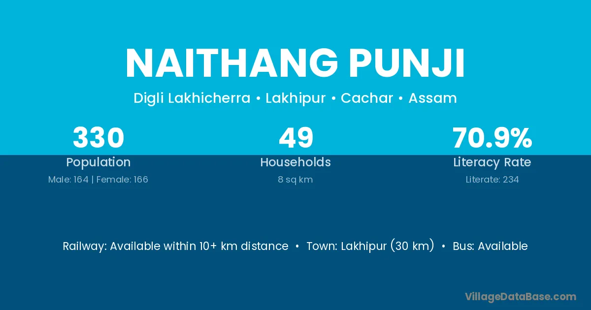 Lakhipur (30 km) is the nearest town to Naithang Punji village for major economic activities and is located approximately 30 km away.