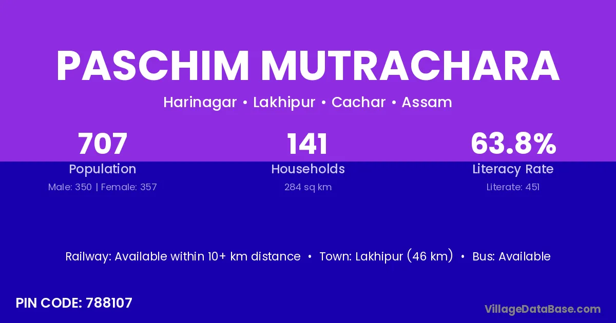 Lakhipur (46 km) is the nearest town to Paschim Mutrachara village for major economic activities and is located approximately 46 km away.