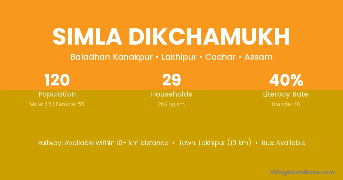 Lakhipur (10 km) is the nearest town to Simla Dikchamukh village for major economic activities and is located approximately 10 km away.