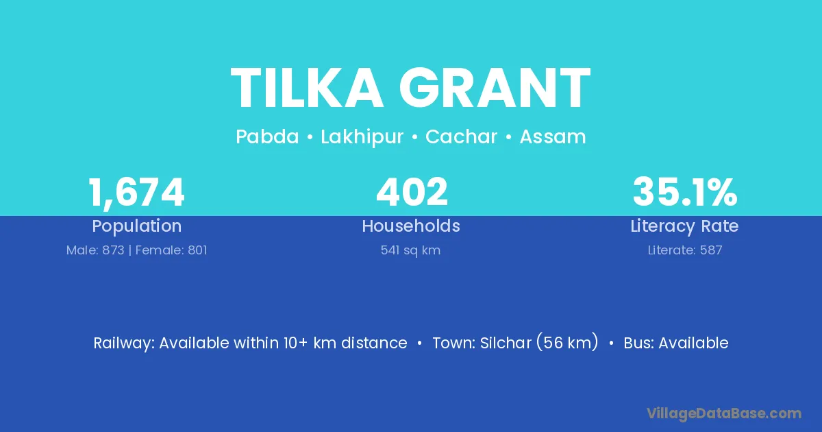 Silchar (56 km) is the nearest town to Tilka Grant village for major economic activities and is located approximately 56 km away.