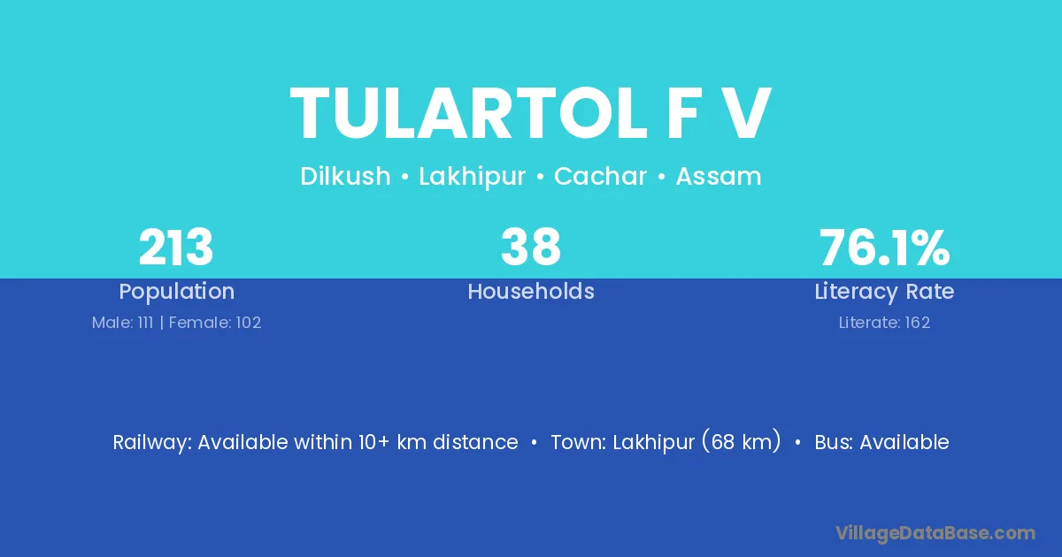 Lakhipur (68 km) is the nearest town to Tulartol F V village for major economic activities and is located approximately 68 km away.