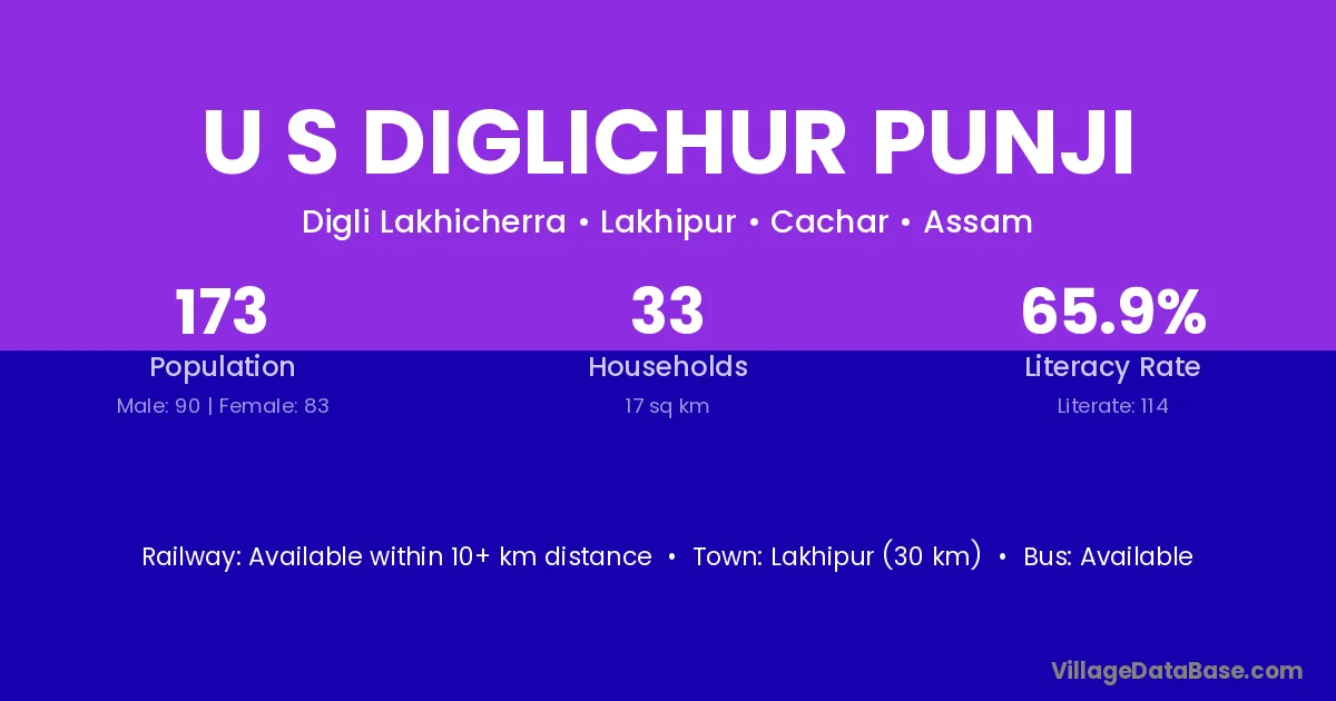 Lakhipur (30 km) is the nearest town to U S Diglichur Punji village for major economic activities and is located approximately 30 km away.