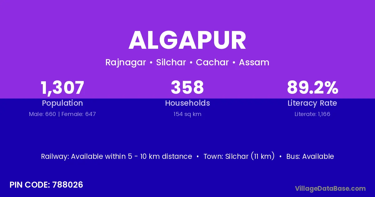 Silchar (11 km) is the nearest town to Algapur village for major economic activities and is located approximately 11 km away.