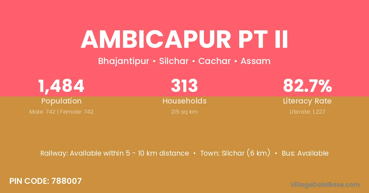 Silchar (6 km) is the nearest town to Ambicapur Pt Ii village for major economic activities and is located approximately 6 km away.