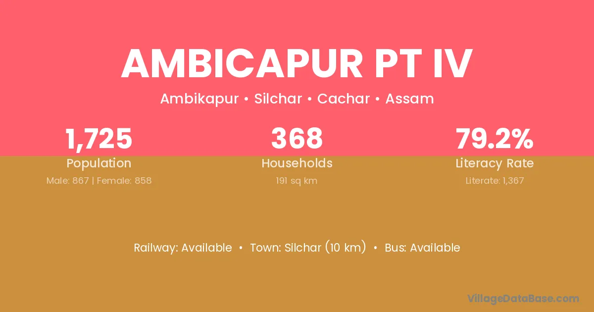 Silchar (10 km) is the nearest town to Ambicapur Pt Iv village for major economic activities and is located approximately 10 km away.
